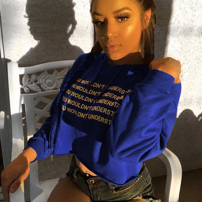 2018 Europe Women Blue Solid Letter Printed Long Sleeve Pullover Sweatshirts Street Outwear Female Purpose Hoodies Tops