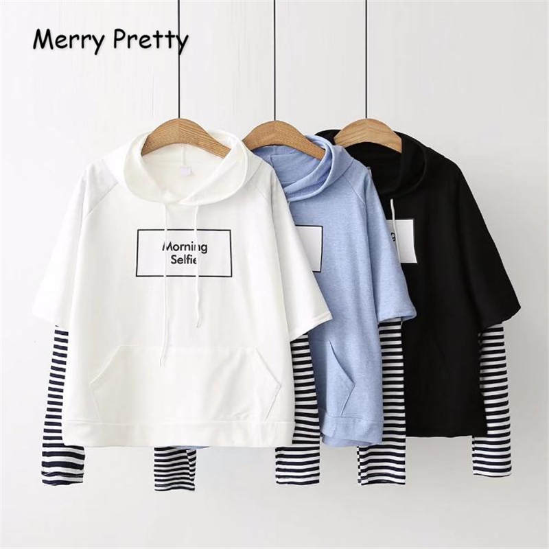 MERRY PRETTY Fake two Pieces Striped Patchwork Hoodies Sweatshirts Autumn Winter Women Letter Print Drawstring Hooded Pullovers