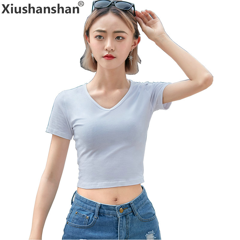 Xiushanshan High Quality 12 Colors Solid S XXL Casual T-Shirt Cotton V Neck Short Sleeve Slim Women Crop Tee