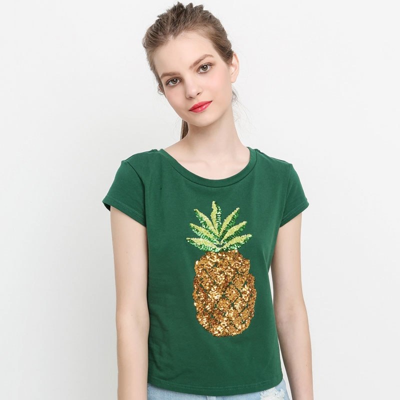 HDY T-shirt Women Pineapple Shirt Women’s Shirt O-neck Summer Shirt Short Sleeve Tee T-Shirts Green Sequined Tops Plus Size